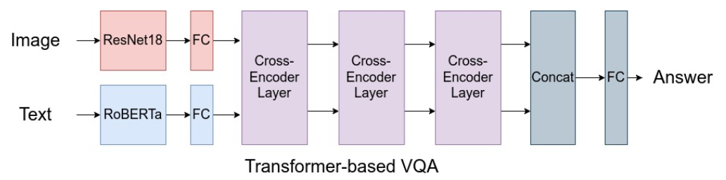 In Visual Question Answering (VQA), given an image and a question about it, our goal is to select an answer from a large pool of possible answers. We implement a transformer based architecture which uses pre-trained ResNet18 and RoBERTa to featurize input images and text.